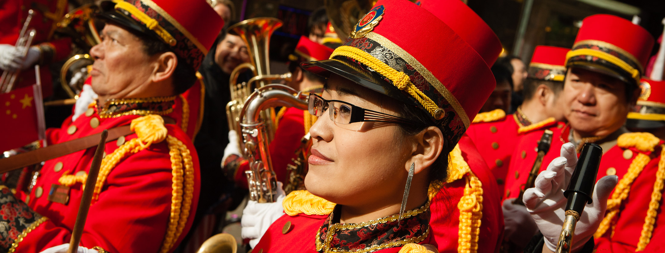 A snare drummer in one of several marching bands in the parade. Drummers in Lunar New Year Parade, Chinatown. New York